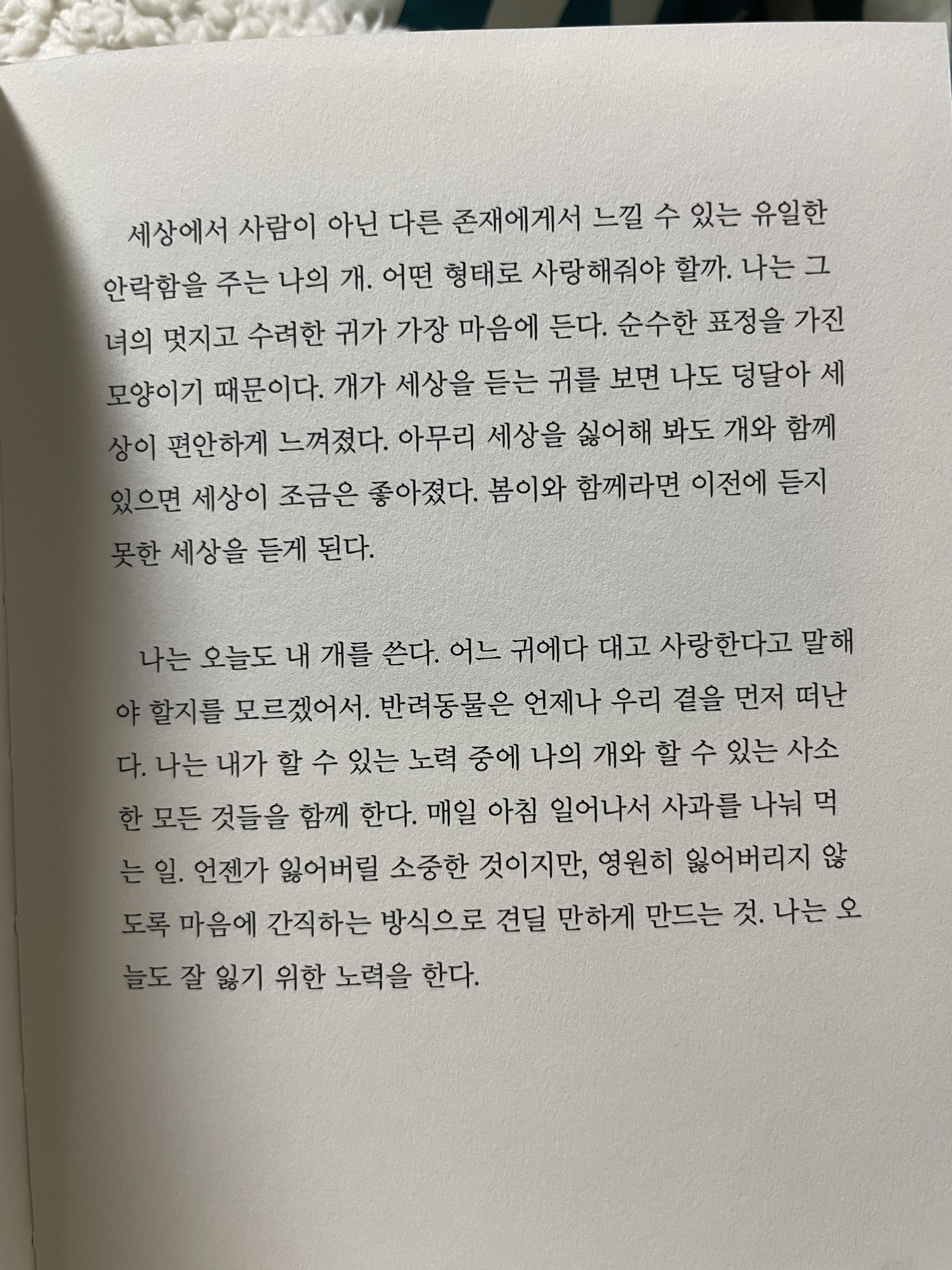 봄이와 함께라면 이전에 듣지 못한 세상을 듣게 된다.나는 내가 할 수 있는 노력 중에 나의 개와 할 수 있는 사소한 모든 것들을 함께 한다.